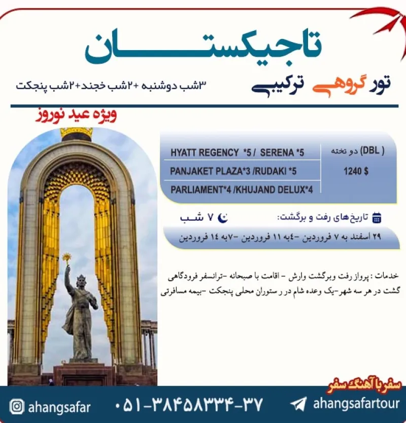 تور گروهی تاجیسکتان ویژه نوروز 14057 شب دوشنبه+خجند+پنجیکت
